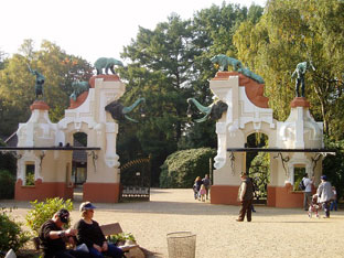 Hagenbeck Tiergarten, Hamburg, with bronze statues of zoo exotica: elephants, lions, bears, African and American humans.