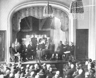 The Commission of Government being sworn in at St. John's, February 16, 1934. The Commission was a group of bureaucrats appointed by the British crown. It governed the nation of Newfoundland until Confederation with Canada in 1949